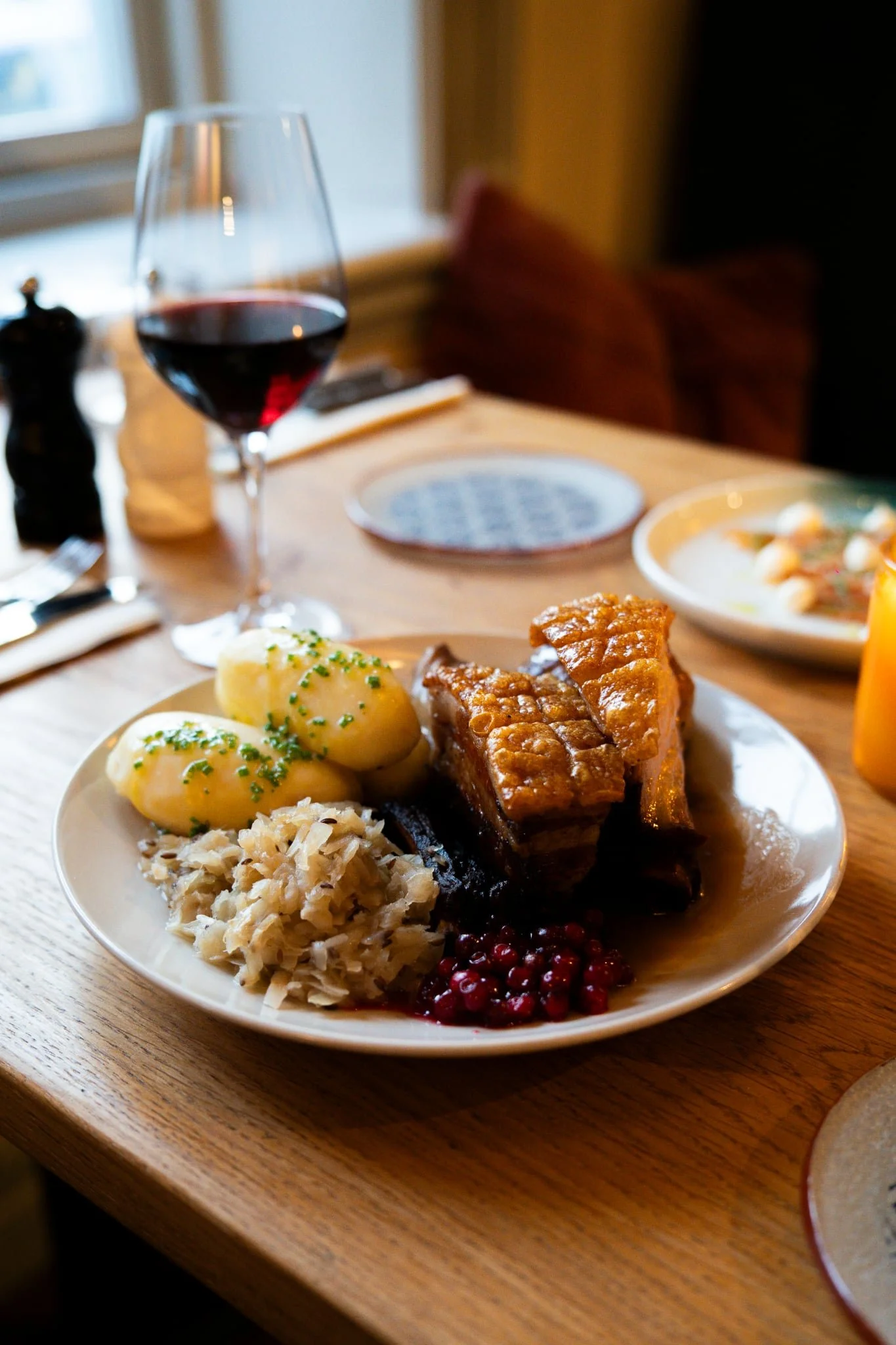 Vår julemeny, tilgjengelig fra 1. november, byr på tre-retters festmåltid med klassikere som gravet Sirdalsørret og lutefisk, ribbe eller pinnekjøtt — alt servert med tradisjonelt tilbehør. Dessertene inneholder sesongens beste, blant annet multer marinerte med akevitt og multemousse .